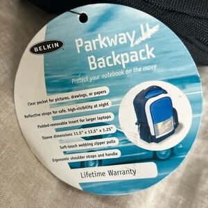 The Parkway II Backpack by Belkin gives you a great way to carry your notebook, books, and supplies between classes. The lightweight Parkway II Backpack features a padded rear panel to cushion your shoulders and back, and a durable, soft mesh handle for easy lifting. The removable padded computer sleeve protects your larger-size laptop. There's plenty of room for pens, pencils, ID cards, paper files, CD or MP3 players, and floppy disks. The Parkway II features a clear front compartment that shows off your drawings, photos, or any paper you want to keep handy and protected.