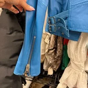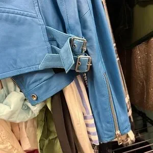Elevate your style with this chic blue leather biker jacket. Perfect for adding a bold touch to any outfit.