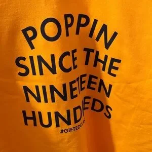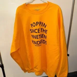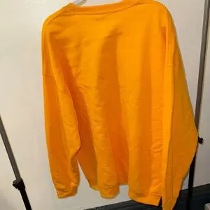 Bright yellow sweatshirt with bold graphic text. Comfortable and stylish.