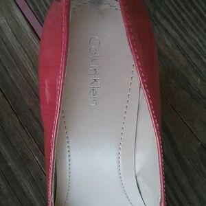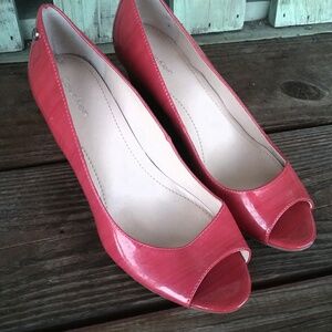 These wedges are pre owned but in excellent condition. They have only been worn once. The wedge heel is 2.5 inches in height.