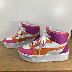 The Puma Karmen Rebelle Mid Sneaker is a trendy and hipster-inspired shoe designed for big kid girls in size 4.5. Featuring a round toe shape, lace-up closure, and low platform heel, these sneakers are made of breathable leather fabric with a rubber outsole for comfort and durability. The colorblock pattern in orange and hot pink with lace accents and a logo detail adds a stylish touch to these athletic shoes. Perfect for casual or activewear occasions, these Puma sneakers are a great choice for young girls looking for a fashionable and comfortable footwear option.