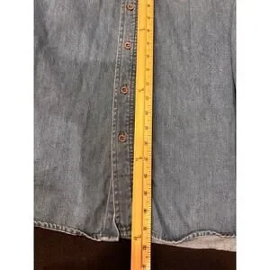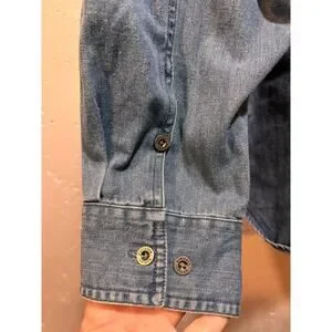 Good preowned condition men’s 2xl tall blue denim button down long sleeve shirt. Embroidered sleeves, Harley patch on chest pocket. Pit-pit 27”, length 31.5”.