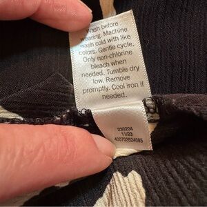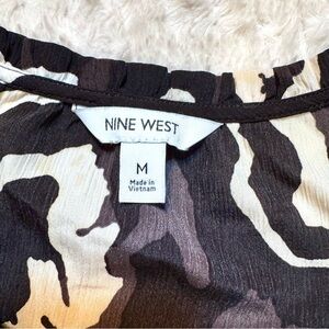 ✨ Elegant + versatile vibes. Nine West sheer short-sleeve blouse featuring a black-and-white abstract / zebra-inspired print with a tie-neck detail. Lightweight and easy to style for day or night.