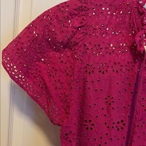 Chic eyelet blouse in a vibrant pink hue. Features a delicate floral pattern and tie detail. Good condition
