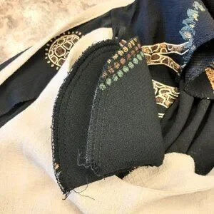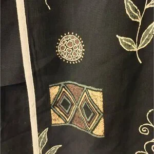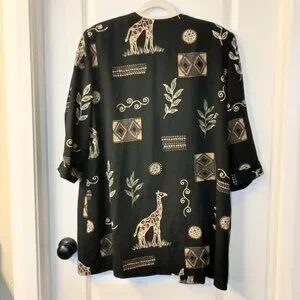 Black background with sewn in mock tee underneath. Has green, brown, and yellow patterns and giraffe print throughout.