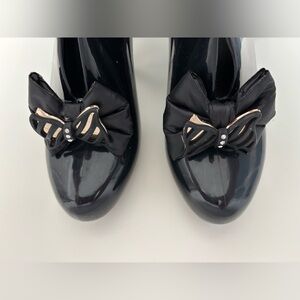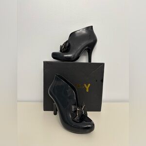 Almost New Dizzy black rain fashion 4" heeled booties with black and gold bow, in excellent condition, the original box have some storage wear.