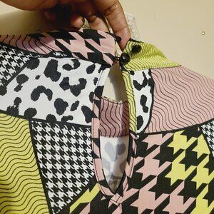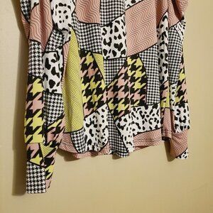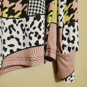 Women's pink and multicolor stretch knit blouse by Ashley Stewart, size 14/16. Top has mixed print throughout, mock neckline, drama puff sleeves and keyhole at back featuring dual button closures at nape.