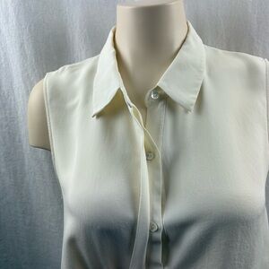 Theory Rosae silk blouse. “A sleeveless Theory blouse with a layered look is styled with a fold-over collar and shirttail hem. A flap covers the button placket for a seamless look. Size L.