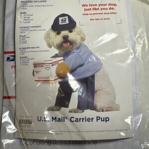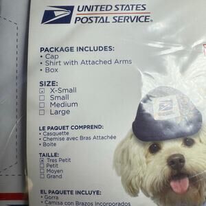 U.S. Mail Carrier Pup Costume Size X-small. Includes cap, shirt w/attached arms and Box. Pup hat strap broken but still works (see photos for details).