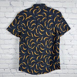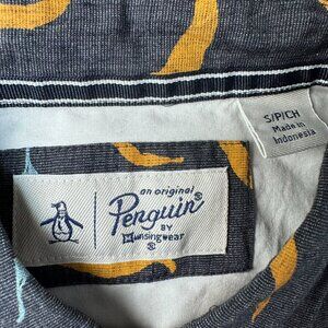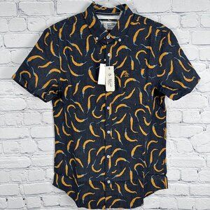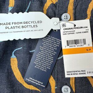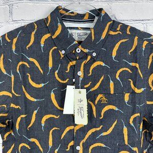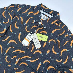 Original Penguin Men's WVN Short Sleeve Chili Peppers Print Button Down Shirt, Size S, Dark Sapphire Blue, 65% Linen, 24% Repreve Polyester, 21% Viscose, Style OPWS2025OP