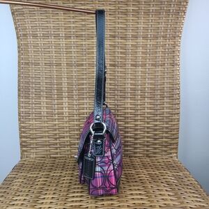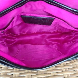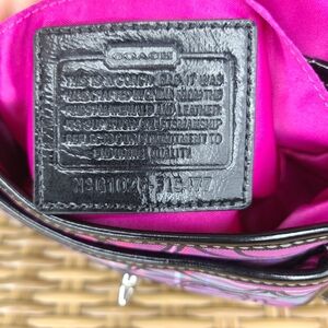 Coach Tartan penny flap purse. Sparkle purple and black plaid fabric with Coach poppy signature print. Black patent leather trim and shoulder strap. Pink inner lining. Interior includes two slip pockets. Silver hardware. Turn lock closure. Coach signature charm/fob.