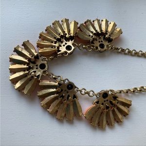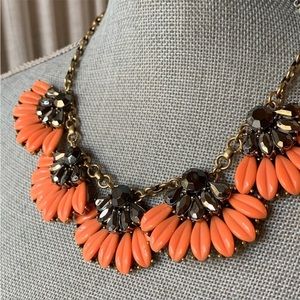 From J. Crew- A Beautiful floral statement necklace with coral colored petals and gunmetal/smokey grey rhinestones. Antique gold tone. Chain length is adjustable from 18-21".