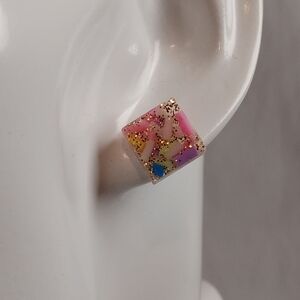 These Hand Crafted earrings feature a stunning blend of pink and blue hues, creating a captivating effect. The square-shaped design is both modern and artistic, making them a unique addition to any jewelry collection. Perfect for adding a touch of elegance and color to your ensemble. 14k gold plated and hypoallergenic earring posts