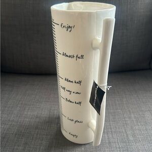 It is made from durable ceramic and features charming side markings with phrases like "Enjoy!", "Almost full", "Half way now", "Last glass", and "Empty".