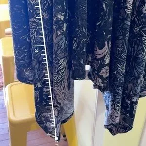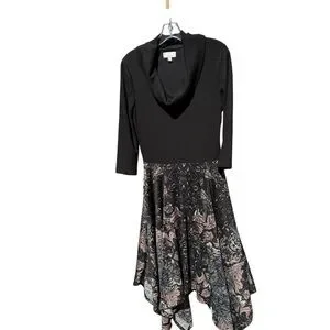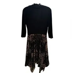 This Signature by Robbie Bee dress combines comfort and elegance. It features a ribbed knit cowl neck bodice and a flowy printed skirt with a handkerchief hem, offering a flattering silhouette and movement. Measurements are shown in the photos.