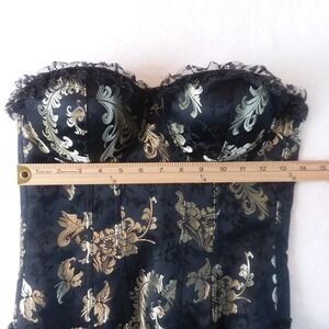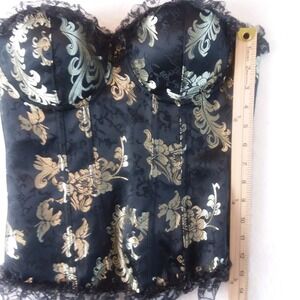 Keywords: corset top, floral corset, black and gold, lace trim, bustier, costume, party top, vintage style, adjustable straps, hook and eye closure, Amscan, S/M, sexy top, lingerie top