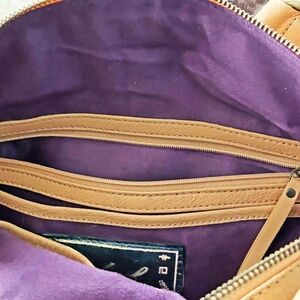 Vibrant embroidered Sharif satchel with floral and bird design in the STYLE of Free People. Features tan leather handles. Perfect for adding a pop of color.