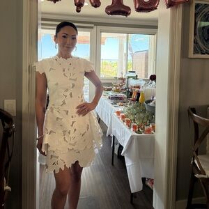 Holloway Embroidered Mini Dress in White. An embroidered mini dress cut from heavyweight cotton to create a sculptural shape on the body. Cap sleeves and cinched waist.