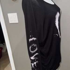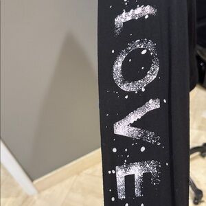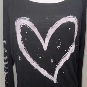 Stylish black top featuring a bold heart print. Perfect for casual outings. Long style and great style. “LOVE” print on sleeve & heart on front.
