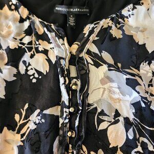 White House Black Market Women 8 Blouse Black White Pleated Floral Long Sleeve V Neck.