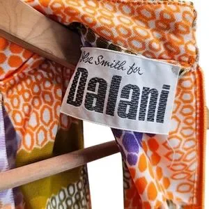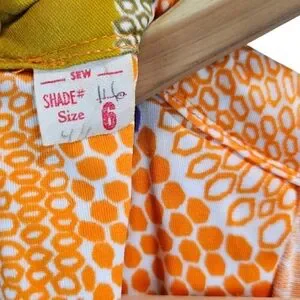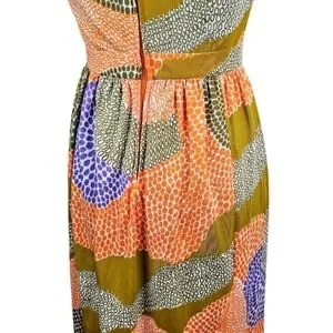• This rare gem features a bold psychedelic print in vibrant orange, mustard yellow, olive green, and purple hues, with intricate circular patterns that scream retro boho chic.