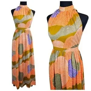 Step into the groovy vibes of the 1960s with this stunning vintage halter maxi dress by Else Smith for Dalani!