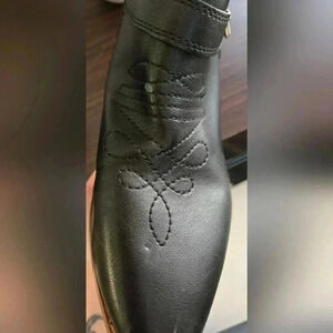 Women's black ankle heeled boots with side zipper and side buckle design. The top of the boot has a stitched design. These boots are a size 9, used but in very good condition. There are a few smudges as seen in the photots.