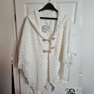 Details: Hooded knit poncho, toggle front closure, textured cable-style knit, fringe hem, soft feel
