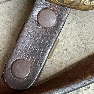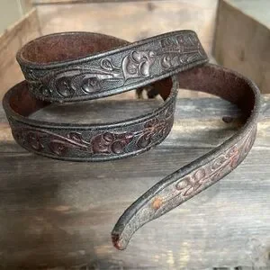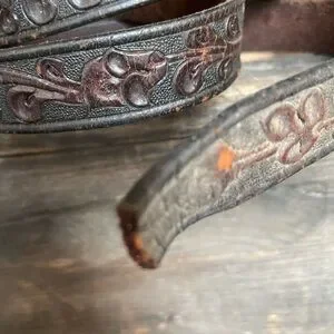 Mark on inside of leather near the buckle reads PARIS 38 Hand Tooled Saddle Leather.