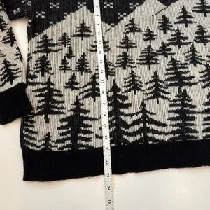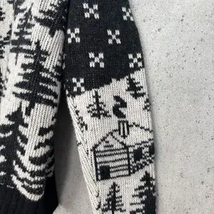 Snow, Mountains, Trees, and one Adorable Cabin-on the left sleeve. Such a fun cold weather sweater :)