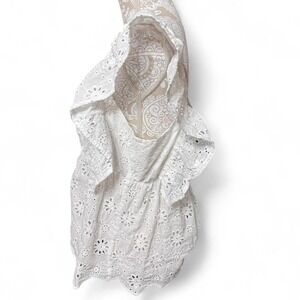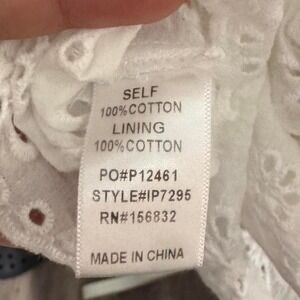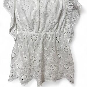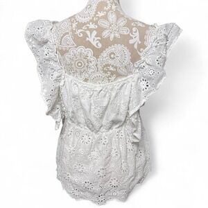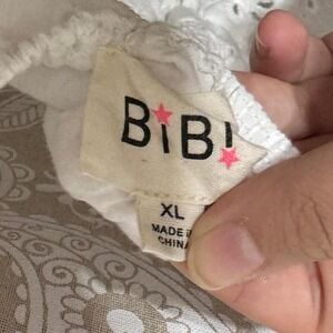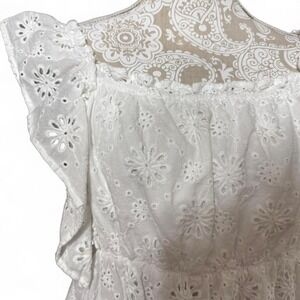 β¨ White eyelet lace blouse by Bibi, size XL. Features delicate floral embroidery throughout with scalloped hems, flutter sleeves, and a cinched elastic waist for a flattering fit. Lightweight 100% cotton with a lined interior β breathable and comfy for spring/summer.