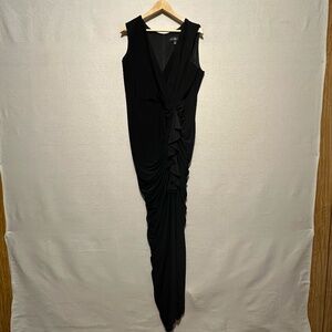 NWT Betsy & Adam "Bobbi" Long Ruffled V-Neck Gown in black. Take risks and make a statement in our "Bobbi" Gown! The jersey knit material offers comfort and movement while the deep V-neck and wrap skirt add a touch of daring. The ruched side ruffle and slit allow for a bold and flattering silhouette! Hidden back zipper for a sleek finish. Size 22W.