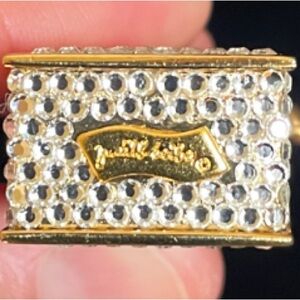 Signed Vintage Judith Lieber rhinestone perfume bottle necklace with heavy gold chain-link chain. This elegant rhinestone and gold perfume bottle measures 2 inches tall and 1 inch wide. The condition of this piece is excellent. The gold chain comes apart into separate chains, one measuring 16 inches and the other measuring 24 inches a total of 40 inches if you wear them together. Original duster included.