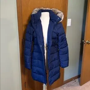 Stylish blue puffer coat. Features faux fur trim on hood. Perfect for cold weather.