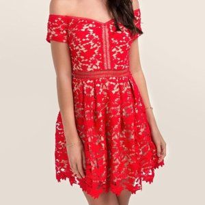 Red Beverly Off the Shoulder Lace Dress from Francesca's. In excellent condition, new with tags. Red crochet floral lace overlay with nude underlay, off the shoulder style with exposed zip closure on back.