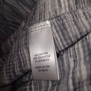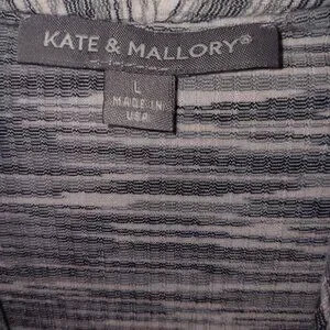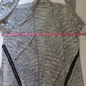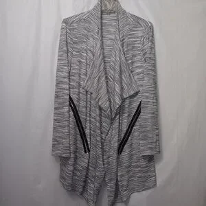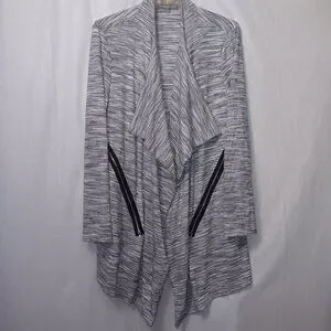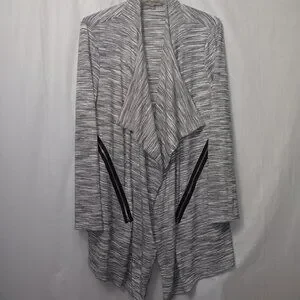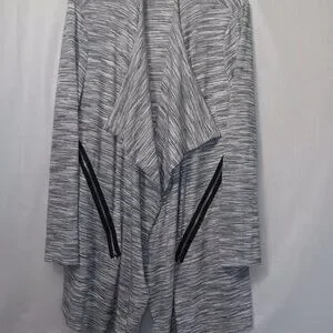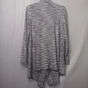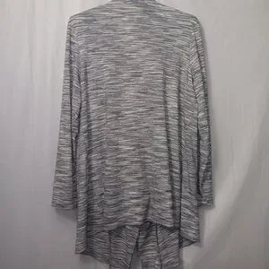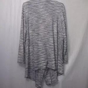 Size Large - Kate & Mallory lightweight open fron cardigan in the colors gray, black, and white the material is 66% rayon, 30% polyester, and 4% spandex in gently used preowned condition