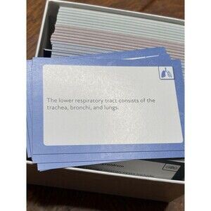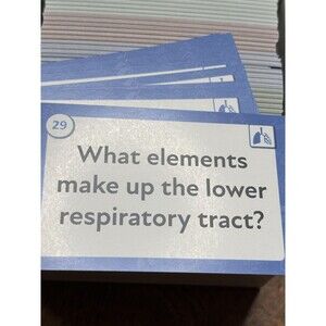 Sample question shown: "What elements make up the lower respiratory tract?" Answer card states: trachea, bronchi, and lungs