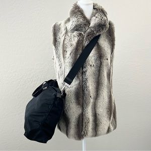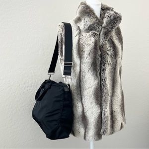 The perfect everyday bag! 100% authentic. 14” L x 11” H x 5” D. Handle drop 5 1/4”. Black nylon with leather trim. Silver tone hardware. Zipper closure. Flat handles. Single flat detachable adjustable shoulder strap. Versatile. Wear as shoulder or crossbody bag. Pre loved, barely used. Minor interior and exterior mark. Pristine condition. Comes with Prada dust bag and authenticity card.
