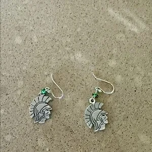 Spartan-themed earrings with green bead accents. Unique and stylish design.