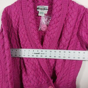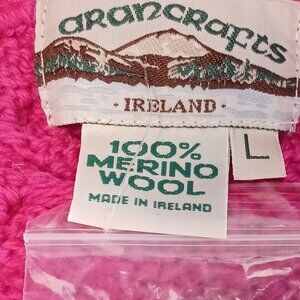 NWOT Aran Crafts Ireland 100% Merino Wool Long Cardigan Pink, SZ Large, One Button Front, No Price Tag, but Has Extra Button and yarn Package tagged to label. This is a chunky knit, loose fit, heavy weight sweater. A great layering piece sure to keep you warm. Has a one button front closure that is off center, with an inside button closure to support the front button closure.