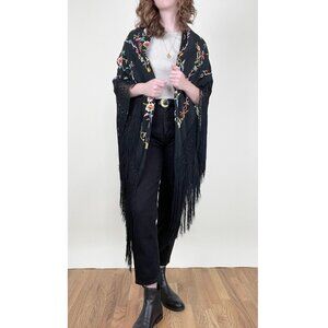 Vintage Embroidered Piano Shawl Manila Silk Fringe Floral Witchy Boho Bohemian