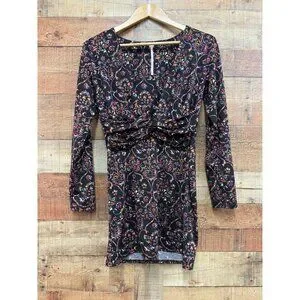 American made colorfully printed silky long sleeve mini dress featuring a plunging V-neckline and a waistband detailing. Slightly stretchy fit.