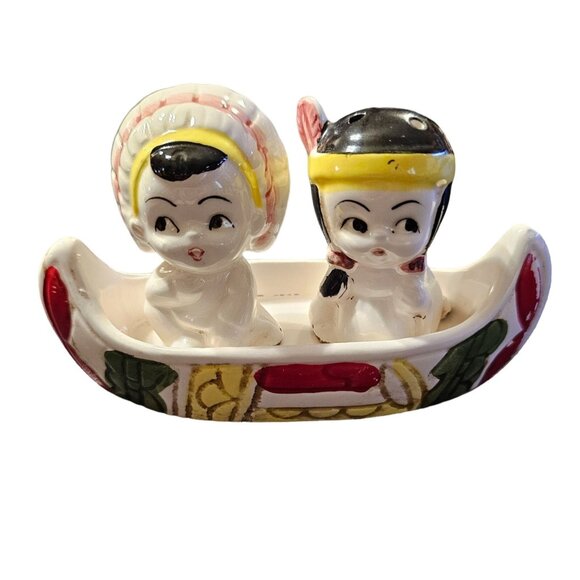 Thanksgiving Table Decor, Native American decor, vintage salt shaker, pepper shaker set, ceramic collectibles, hand-painted decor, canoe salt holder, hand-painted shakers, retro salt pepper, retro kitchen accessory, collectible kitchenware, ceramic kitchen decor, vintage tableware set, decorative kitchen pieces