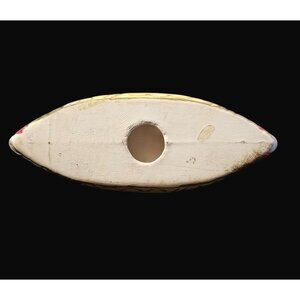 Minor paint wear on canoe edges, no cracks or chips observed. Canoe length = 5 inches, shaker height = 2.5 inches.