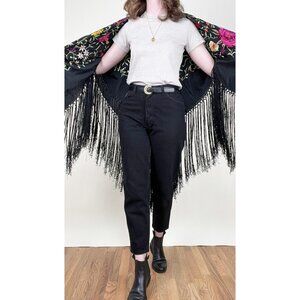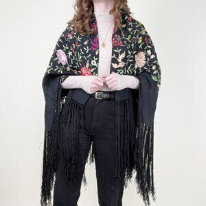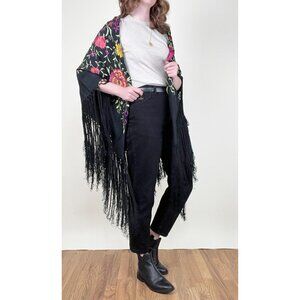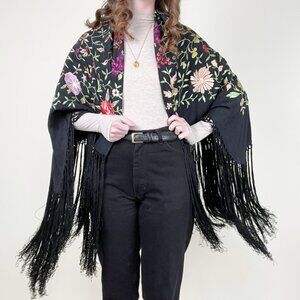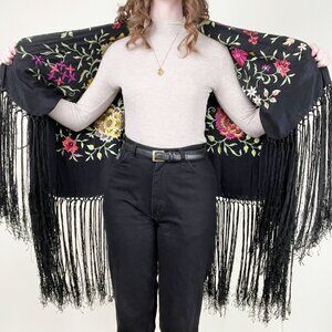 Vintage Piano Shawl Embroidered Floral Silk Fringe Witchy Boho Bohemian Manila