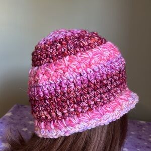 Stay cozy and stylish with this handcrafted crochet hat. Featuring a beautiful blend of pink and purple hues, this accessory is perfect for adding a pop of color to your outfit. Crochet handmade pinwheel button flower beanie medium soft acrylic yarn new never worn clean. Warmest winter hat wash suggestion in tied pantyhose sock or cloth laundry bag to prevent piling fuzz and maintain form and beauty.