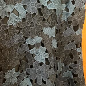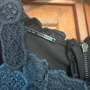 Elie Tahari Ophelia Lace Sheath Dress in Black/Blue in size 4. Chic openwork lace in a delicate floral design covers the Ophelia dress. The neckline is detailed with undulating scalloped trim, while the live-edge hem adds dimension to this sophisticated and sexy dress by Elie Tahari. In deep ocean blue floral lace layered over black.