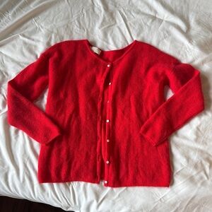 Bright red cardigan with button details. Soft and comfortable for everyday wear.