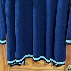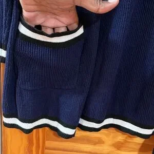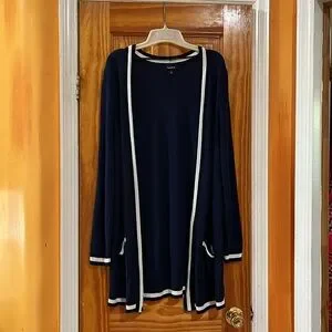 Stay cozy and stylish with this navy blue open front cardigan sweater which is in very good preowned condition. Perfect for layering, it features a classic design with contrasting trim. Ideal for any casual outings.