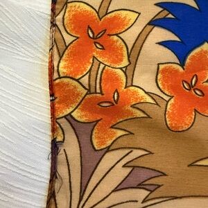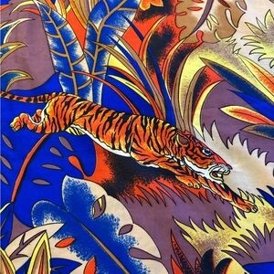 Design: Bold jungle scene with leaping tigers and leopards among tropical foliage in cobalt blue, orange, gold, and brown. Most consistent with late 1980s–1990s oversized fashion scarves.